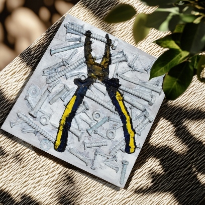 В 7м сезоне моя работа была представлена на выставке "Искусство труда". Концепция идеи была в том, что человек, который местерит руками часто "теряет" инструменты. Вот только положил на место, отвернулся и все, больше ты не видишь, к примеру, пассатижи. Мелкие предметы на столе "поглощают" внимание и не дают найти нужного. На деревянную основу прикреплены гайки, шурупы, старые ключи, саморезы и гвозди. Все это представляет собой однородную поверхность и объединено белым фоном. Поверх этой неровной массы написано масляными красками натуралистическое изображение пассатижей. Для того, чтоб навсегда избавиться от "хитрости маскировки". Но и это еще не все! Шурупы и гайки покрыты краской, которая светится в темноте и ночью, вы не сможете увидеть инструмент, но вот "хитрые гвоздики" будут сиять ярким голубым светом.
